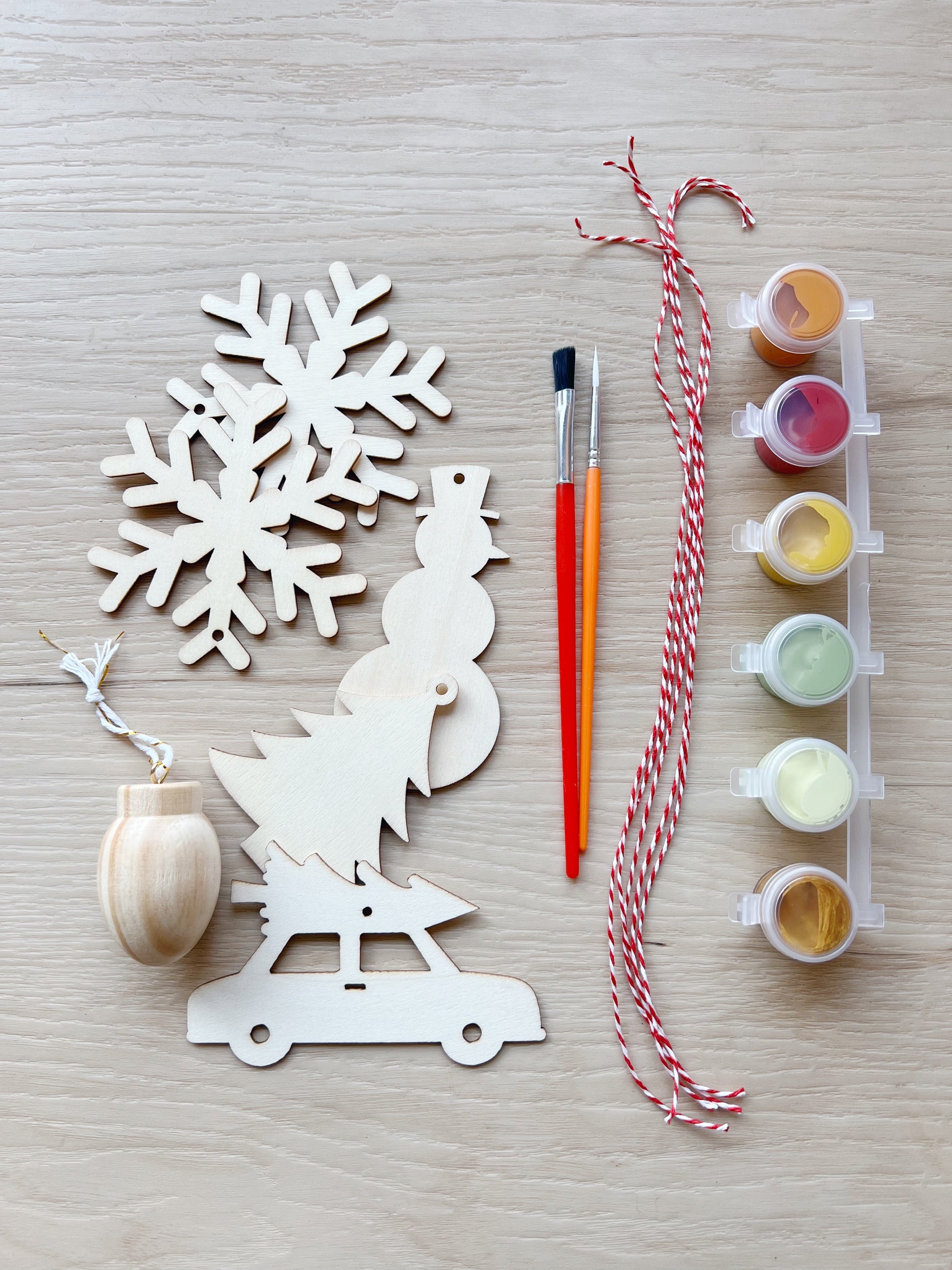 With this paint your own ornament kit, kids will love transforming the blank slate of six wood ornaments into something all their own. They are great for a holiday craft day and make cheerful handmade gifts, equally great as ornaments or gift toppers.
